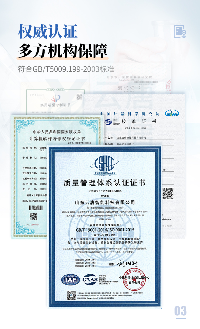 山東云唐智能科技有限公司生產(chǎn)的高智能食品安全檢測儀可快速檢測200多種食品安全項(xiàng)目,包含非食用化學(xué)物質(zhì)、濫用食品添加劑、農(nóng)藥殘留、獸藥殘留、重金屬、病害肉、營養(yǎng)強(qiáng)化劑、抗生素類殘留、激素類殘留、真菌毒素類殘留、化學(xué)類殘留等項(xiàng)目的定性定量檢測。