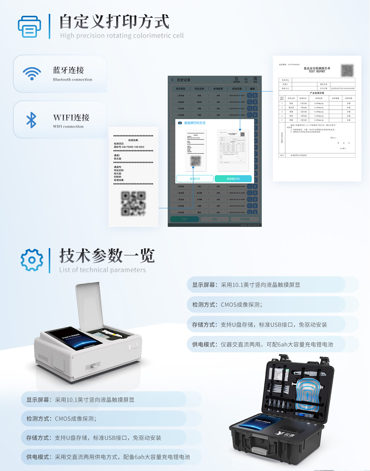 9、A4紙版本報(bào)告打印功能(可選配):設(shè)備擁有兩種結(jié)果展示方式,可以自動(dòng)生成A4打印模板和小票打印模板兩種樣式,可通過(guò)WiFi及網(wǎng)線(xiàn)等方式鏈接外置打印機(jī)可進(jìn)行打印