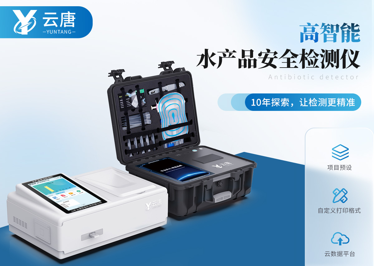 山東云唐智能科技有限公司生產(chǎn)的水產(chǎn)品安全檢測(cè)儀可適用于魚、蝦等水產(chǎn)中孔雀石綠、氯霉素、硝基呋喃類:呋喃唑酮(AOZ)、呋喃它酮( AMOZ )、呋喃妥因(AHD)、呋喃西林(SEM)、呋喃那斯、磺胺類、激素類、四環(huán)素類、金霉素、土霉素、甲砜霉素、氟苯尼考、喹諾酮類藥物:噁喹酸、諾氟沙星、恩諾沙星、環(huán)丙沙星、氧氟沙星等藥物殘留的定性檢測(cè)